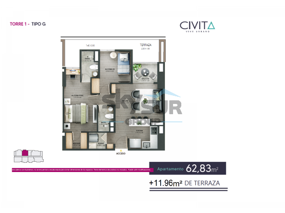 Venta de Cesión de derechos en exclusivo proyecto al sur del Valle de Aburrá. Ubicación estratégica e inmejorable: a pocos pasos de la estación del Metro de Itagüí, con fácil acceso vehicular y peatonal por las avenidas Las Vegas y Regional. Rodeado de importantes puntos de interés como Mayorca MegaMall, el Polideportivo Sur y próximamente Arena Primavera. El apartamento cuenta con 62 m², distribuidos en 2 alcobas (principal con baño y vestier), alcoba auxiliar con clóset, baño social completo, salón-comedor, cocina abierta, balcón con vista occidental privilegiada y garantizada, parqueadero sencillo y cuarto útil. Ubicado en una unidad residencial súper completa, ideal para vivir o invertir.